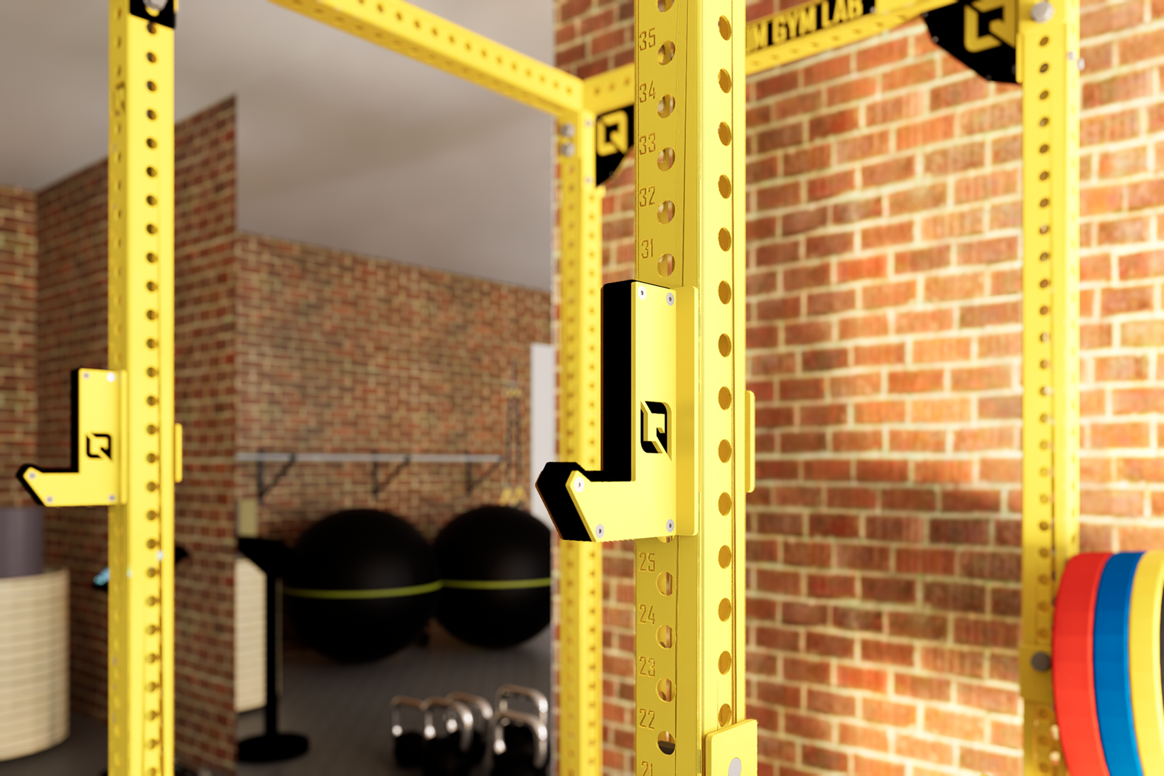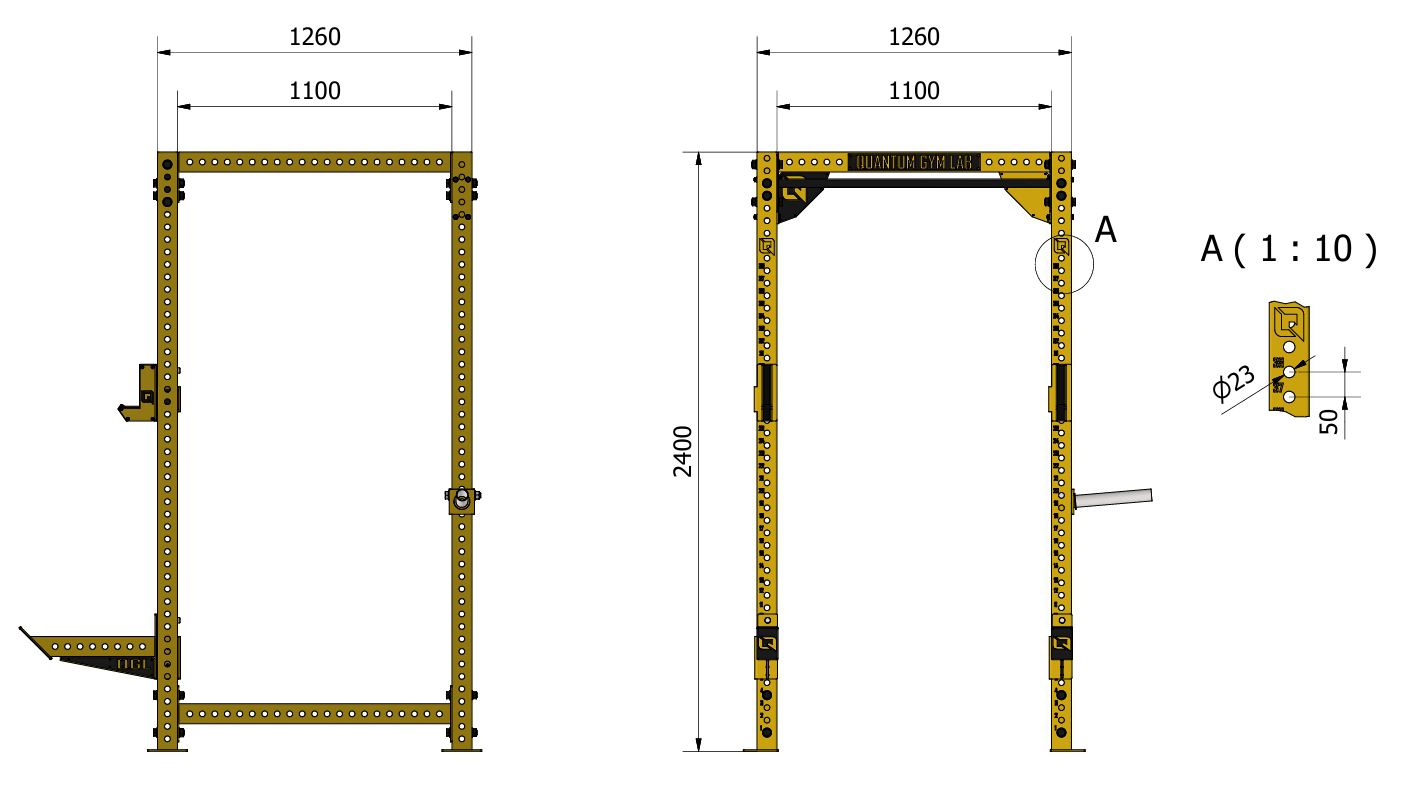 - 3 types of columns with hole spacing : 50 mm, 150mm and 50 mm compacted hole centerline in areas for squats and bench press